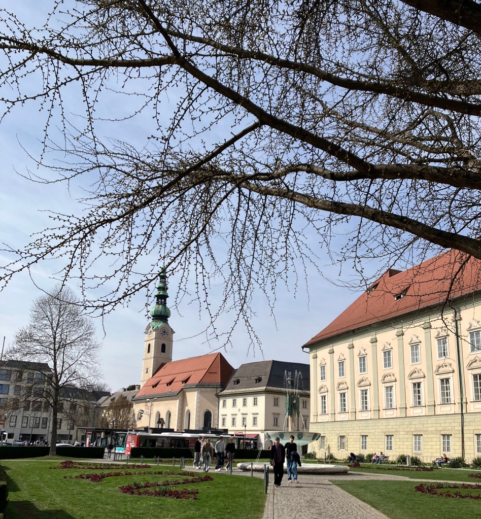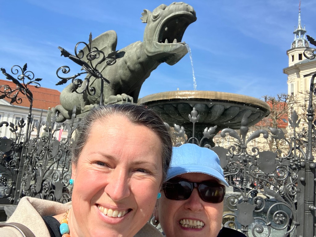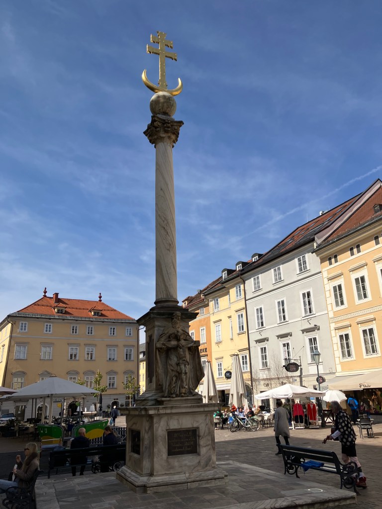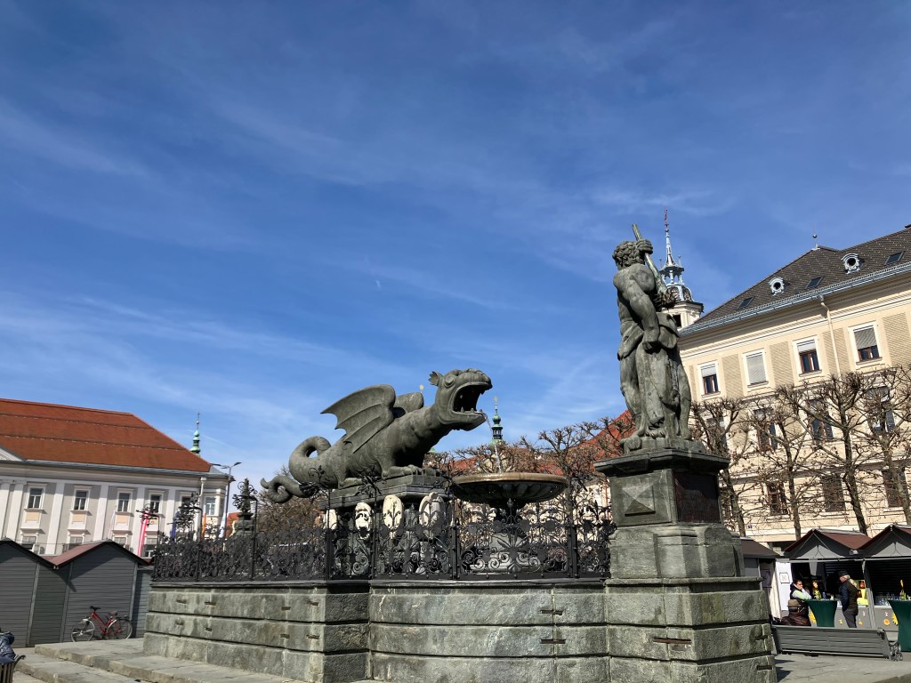 Bei traumhaftem Wetter führte uns der erste Weg gleich zum Neuen Platz mit dem Lindwurm-Brunnen, der so kurz vor Ostern von zahlreichen Standln mit schönem Osterhandwerk umstellt war.